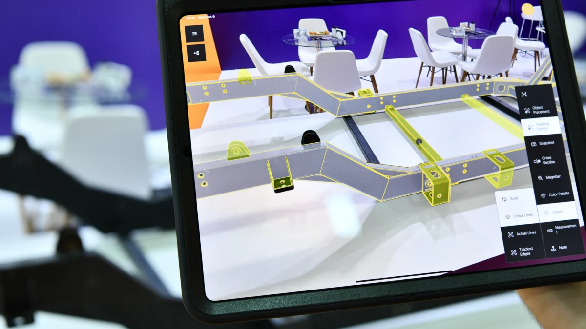 Physical-Digital Mockup enabling workers to see virtual CAD models overlaid on real welded structures to determine the next assembly steps. Digital assembly instructions ensure a faster, safer, and more accurate production process.